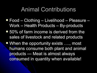 Animal agriculture makes significant contributions to meeting human needs by providing food, clothing, livelihoods, and pleasure. Livestock convert feed into high-quality protein for human consumption. The top sources of protein worldwide are fish, pork, beef, and poultry. Livestock also generate income and jobs, especially in Iowa where livestock production represents about 50% of net farm income and supports over 70,000 jobs. Advancements in genetics, nutrition, health, and management have led to major increases in production efficiency over the past century.
