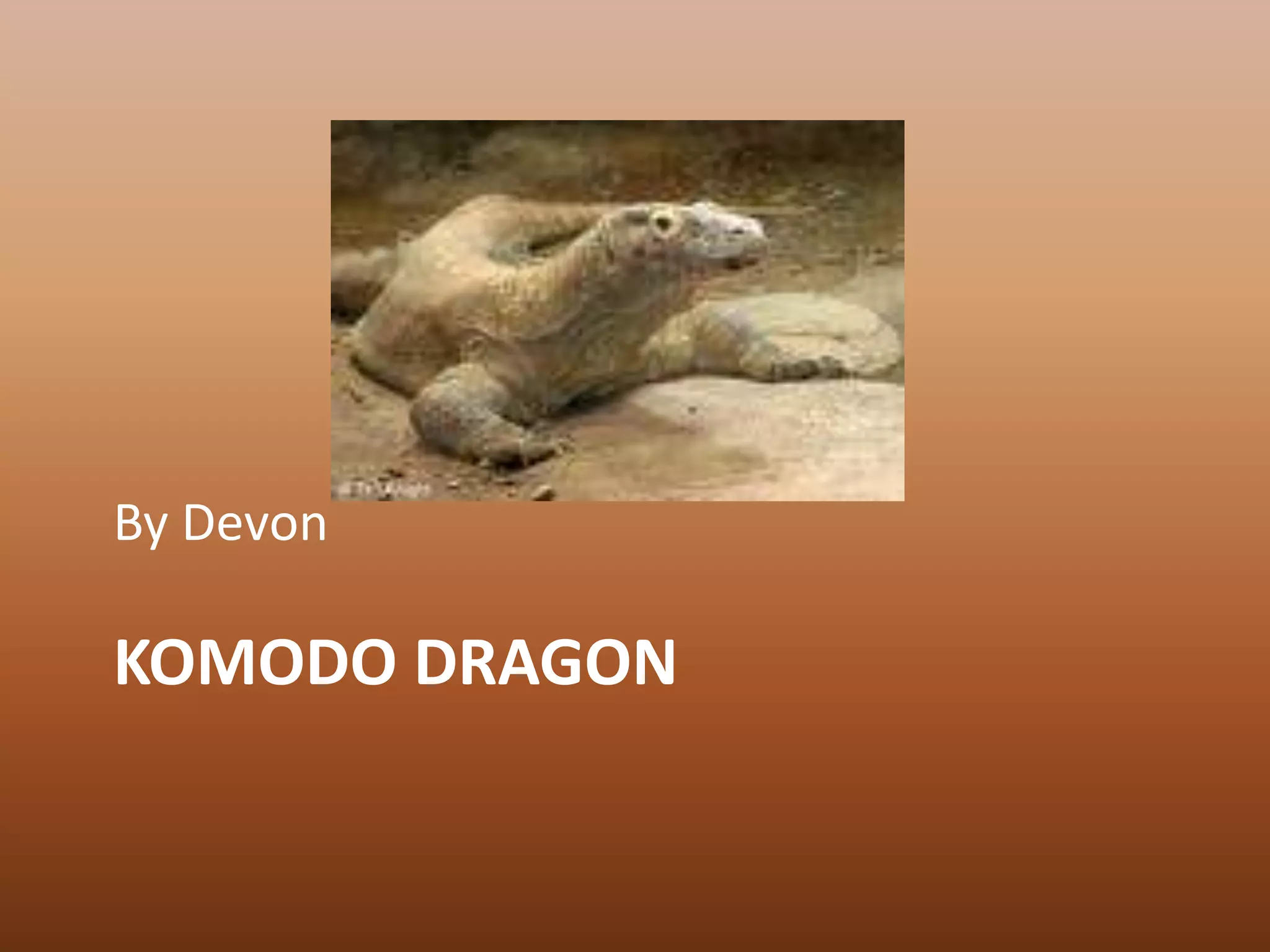 The komodo dragon lives in Indonesia and eats large animals like deer, water buffalo, and smaller komodos. It has a flexible throat and strong jaws to eat large chunks of meat, intestines, and bones. The komodo can grow up to 10 feet long and weigh over 350 pounds. It lives in volcanic habitats on small Indonesian islands and will defend its territory and mates aggressively. The komodo dragon population is estimated between 2,500-5,000 and may be endangered due to their small habitat range.