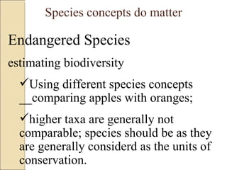 There are many different concepts of what constitutes a species. These concepts include biological, ecological, evolutionary, phylogenetic, and morphological species concepts. There is no universal agreement on how to define species. Applying different concepts can lead to inconsistent estimates of biodiversity. While species are generally considered the basic units of conservation, higher taxa may not be comparable depending on the species concept used.