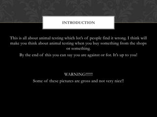 The document discusses animal testing, which involves testing products like medicines, cosmetics, and cleaning supplies on animals to determine if they are safe for human use. It notes that animal testing is controversial, with some people supporting it because it protects humans from harm, while others oppose it because of the suffering it causes animals. The document provides details on the conditions animals experience during testing, such as being confined to small spaces and experiencing pain, and the large numbers of certain animals, like mice and rats, that are killed each day through testing. It aims to help readers make an informed decision about whether they support or oppose animal testing.