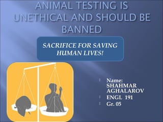 The document argues that animal testing is important and ethical for advancing biomedical research and saving human lives. It states that scientists use animal testing to learn cures for dangerous diseases and enable organ transplantations. It also notes that drugs must be tested on animals before being used on humans to understand their effects and safe dosages. The document claims animal testing also benefits animals by leading to drugs that save millions of animal lives and nutrition that helps animals live longer. It strongly believes animal testing is moral and should not be banned.