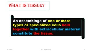 The document discusses different types of animal tissues, including their structures and functions. It covers four main types of tissues - epithelial tissue, connective tissue, muscular tissue, and nervous tissue. Connective tissue is further divided into fibrous, supportive and fluid connective tissues. Specific tissues discussed in detail include areolar tissue, adipose tissue, bones, cartilage, blood, and nerves. The key roles of different tissues in the structure and functioning of the body are also summarized.