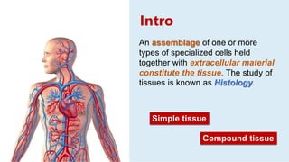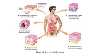 Animal tissues can be grouped into four basic types: epithelial, connective, muscular and nervous tissue. Epithelial tissue forms the outer covering of the body and internal organs and has several subtypes including squamous, cuboidal and columnar epithelium. Simple epithelium is a single layer of cells while compound epithelium has multiple layers. Epithelial tissues function to protect the body, aid absorption and elimination, and perform secretion in some areas.