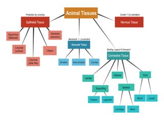 Connective tissues connect and support other tissues in the body. The main types are blood, bone, cartilage, dense connective tissue, adipose tissue, and blood. Blood transports nutrients and oxygen, removes waste, and has red blood cells, white blood cells and platelets. Bone provides structure, support and protection and contains collagen fibers and mineral salts. Cartilage contains collagen fibers and glycosaminoglycans to connect tissues and provide flexibility. Connective tissues come together to form the framework that holds the entire body together.