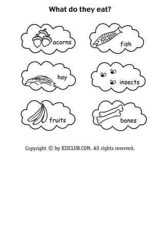 This document provides information about the diets of different animals. Squirrels, monkeys and dogs eat nuts, fruits and insects. Frogs and seals eat fish. Horses eat hay.