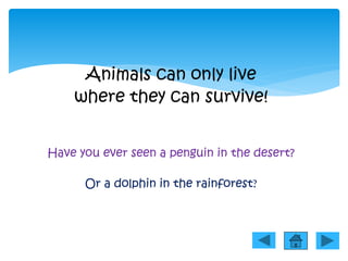 1) This document provides instructions for a 2nd grade WebQuest on animal habitats. Students will learn about habitats, choose an animal to research, and create a poster showing the habitat and what the animal needs to survive.