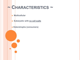 1) Kingdom Animalia includes multicellular, eukaryotic organisms that are heterotrophs and have a nervous system and locomotion abilities to obtain food.