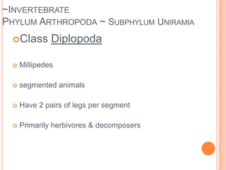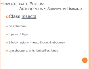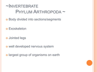 3) Invertebrates make up 95% of animal species and include sponges, cnidarians, flatworms, roundworms, mollusks, annelids, echinoderms and arthropods like insects, spiders and crustaceans