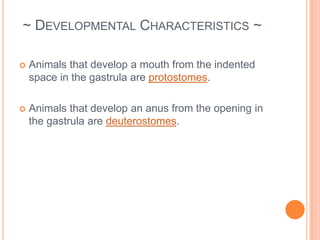 2) Animals develop from a zygote into a gastrula with three germ layers - ectoderm, endoderm and mesoderm - that form the skin/nervous system, digestive tract and muscles/circulatory system, respectively.