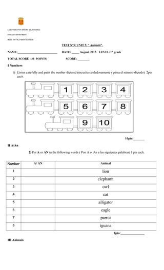 This document is an English test from Liceo Nuestra Señora del Rosario for 1st grade students. The test has 30 total points and covers vocabulary about animals. It includes sections on numbers, articles "a" and "an", matching pictures of animals to their written names, and drawing various animals. Students are asked to complete tasks like listening to dictated numbers, identifying whether articles are "a" or "an", looking at pictures and writing the corresponding animal names, and drawing pictures of different animals.