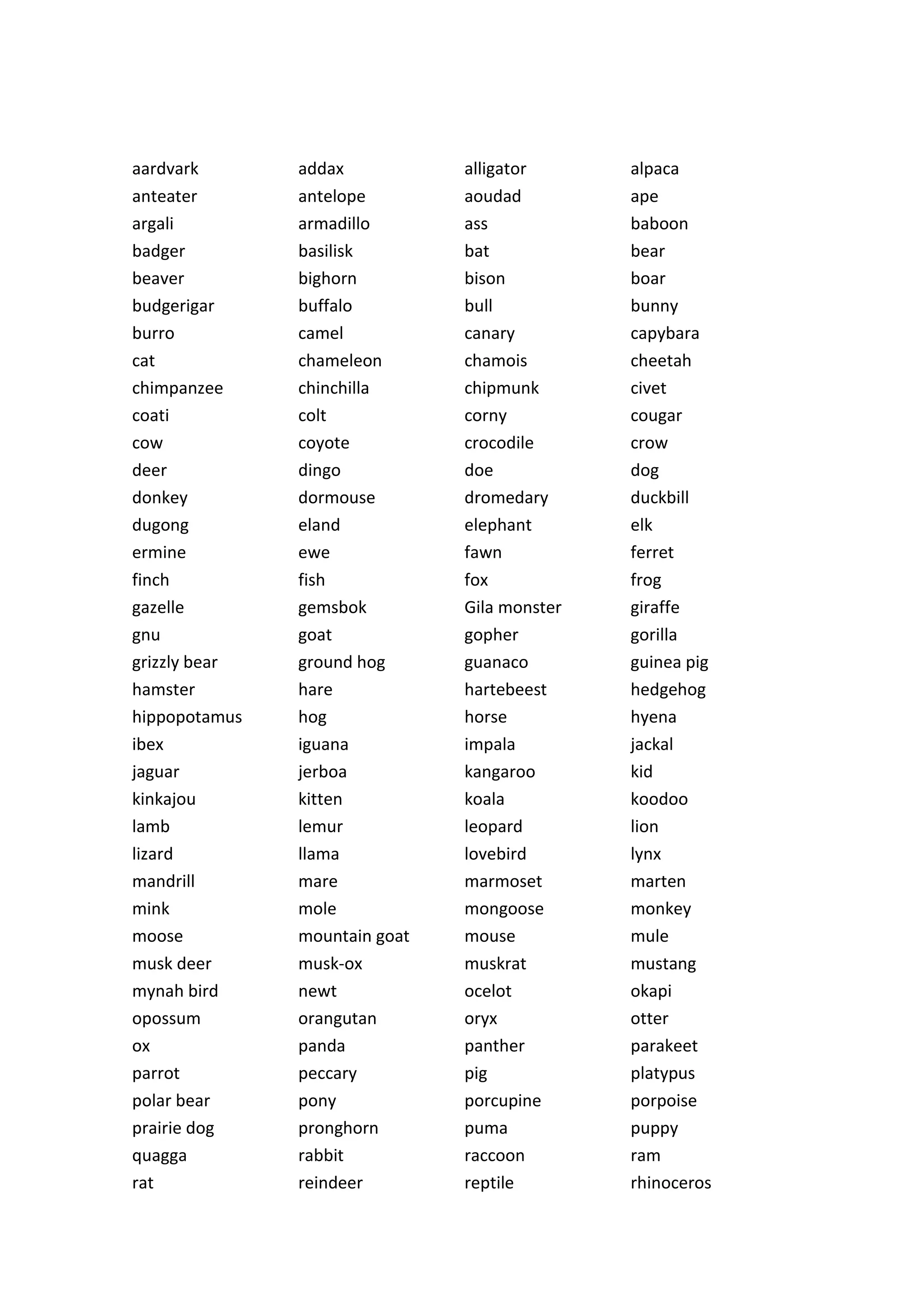 The document lists the scientific names of various animals, parts of the body, verbs, colors, and fruits. It provides a comprehensive taxonomy of terms across these categories for easy reference.