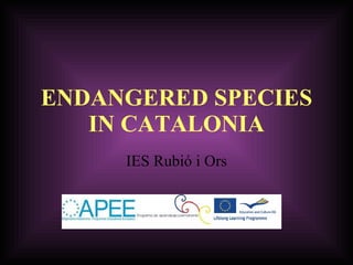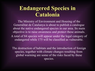 The document summarizes information about several endangered species in Catalonia, including the wolf, Albera cow, ferret, black vulture, Bonelli's eagle, brown bear, Hermann's tortoise, small krestel, Catalan donkey, and samaruc. It notes that the main threats facing these species are the destruction of habitats, introduction of foreign species, climate change, reduction of prey populations, and human development activities.