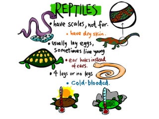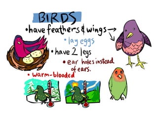 This document discusses different animal groups and their characteristics. It covers carnivores, scavengers, omnivores, and herbivores based on their diets. It then discusses different mammal groups like primates, cetaceans, and mammals with hooves. Bird groups discussed include flightless birds, waterfowl, birds of prey, and songbirds. Reptile groups covered are lizards, crocodiles and alligators, tortoises, and snakes.