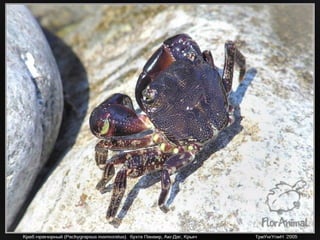 Документ представляет собой проект о разнообразии животного мира, подготовленный учителями начальных классов Оксаной Галаевой и Мариной Куликовой. Он рассматривает различные группы животных, такие как рыбы, земноводные, пресмыкающиеся, птицы, насекомые и млекопитающие, ставя вопросы о причинах их разнообразия. В проекте использованы фотографии с нескольких веб-сайтов.