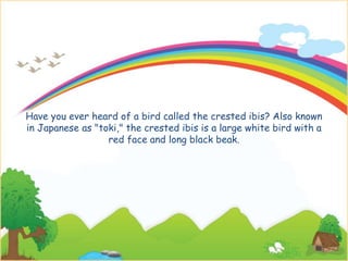 The crested ibis is a large white bird with pink wings and a long black beak that once lived throughout East Asia, but its numbers declined rapidly in the second half of the 20th century. People in Japan have tried protecting the birds in a special facility, adopting a bird from China to artificially hatch chicks, but if these attempts fail and the last crested ibis dies, this type of bird will be extinct.