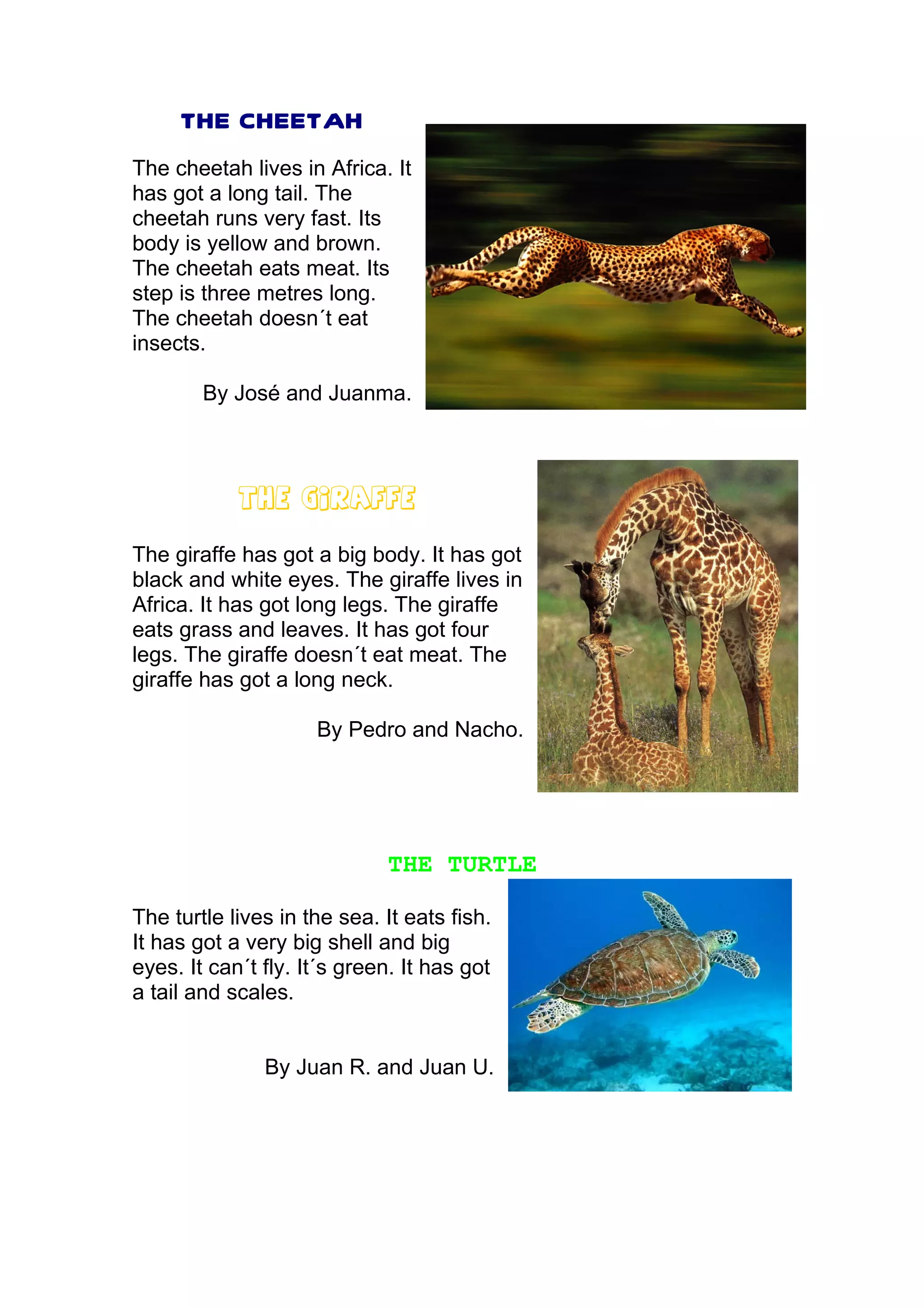 The document describes several different animals including the cheetah, giraffe, turtle, white tiger, anaconda, koala, rhino, and leopard. The cheetah lives in Africa and runs very fast. The giraffe lives in Africa and has a long neck and legs. The turtle lives in the sea and has a large shell. The white tiger lives in India and Siberia and has black and white fur.