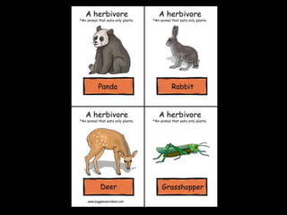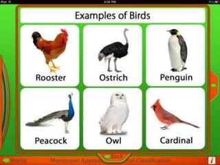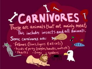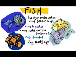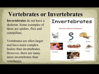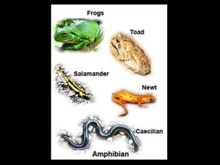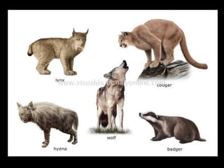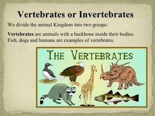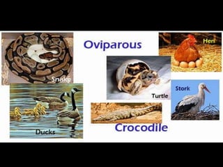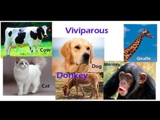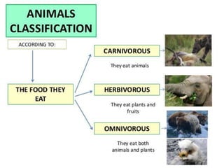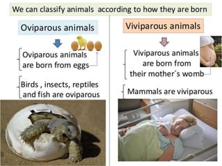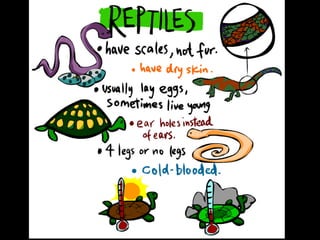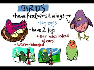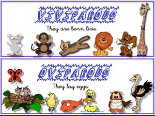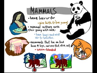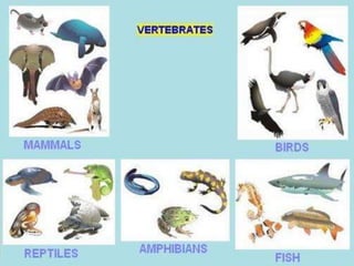 This document provides information about different types of animals categorized into mammals, birds, reptiles, amphibians and fish. It describes their key characteristics such as skin/feather coverage, reproduction methods, habitat, locomotion and other distinguishing biological traits. Examples are given for common animals that fall under each category. The document also includes some interactive games and videos related to learning about different animals.