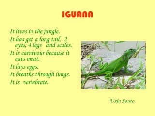 The document contains summaries of different animals written by students, including an iguana, mosquito, cat, snake, deer, komodo dragon, hen, and lion. It provides key details about each animal such as what it is (mammal, reptile, insect, bird), where it lives, its physical features, what it eats, how it reproduces, how it breathes, and whether it is vertebrate or invertebrate.