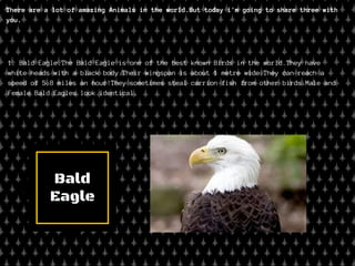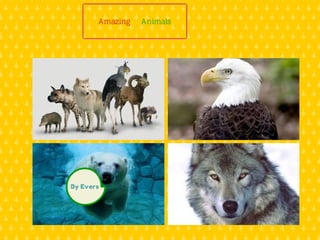 This document summarizes three amazing animal species: the bald eagle, polar bear, and wolves. It notes that bald eagles have a white head and black body, with a wingspan of about 1 meter and can reach speeds of 5.8 miles per hour. Polar bears adapted to the arctic by developing white fur to help with hunting and camouflage, and are strong swimmers. Wolves live in packs, have great eyesight, and can run up to 2.5 miles per hour.