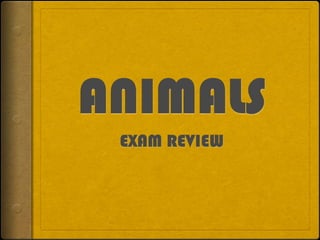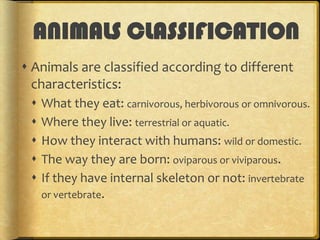 This document classifies and describes different types of animals. It discusses how animals are classified based on their diet, habitat, interactions with humans, means of birth, and whether they have an internal skeleton or exoskeleton. Key animal groups covered include mammals, birds, reptiles, amphibians, fish, arthropods such as insects and arachnids, mollusks, and others. Their defining characteristics and examples of common animals in each group are provided.