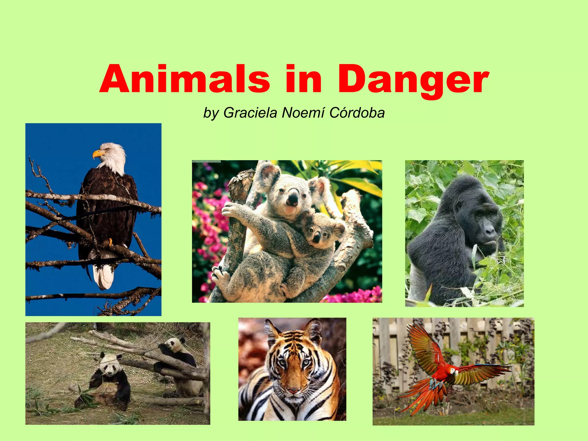 The document discusses 6 animals that are endangered: the Indian tiger, gorilla, koala, bald eagle, scarlet macaw, and giant panda. It provides basic facts about where each animal lives, what it eats, its physical description, and the main threats to its survival, which in most cases is habitat destruction and hunting. The purpose is to teach English language learners about endangered animals and their conservation through identifying, describing, and asking/answering questions about different species and their characteristics.