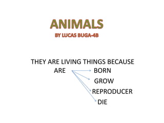 This document defines living things and classifies animals. Living things are born, grow, reproduce, and die. Animals are classified based on their skeleton (vertebrates have backbones, invertebrates do not), diet (carnivores eat other animals, herbivores eat plants, omnivores eat both), and birth (oviparous animals lay eggs, viviparous animals are born alive from their mother's uterus). Mammals are defined as viviparous vertebrates that feed their young milk. Examples of mammals and their characteristics are provided for carnivores like wolves, herbivores like horses, and omnivores like bears.