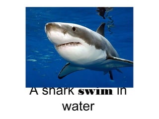 Animals move in different ways depending on their environment - sharks swim in water while storks fly in the air, snakes slither on land, and elephants walk on land. The document provides short descriptions of how different animals like sharks, storks, snakes, and elephants move in their habitats.