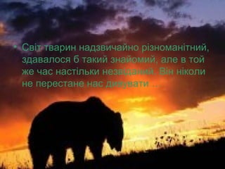 Світ тварин надзвичайнорізноманітний, здавалося б такий знайомий, але в той же час настільки незвіданий. Він ніколи не перестане нас дивувати …