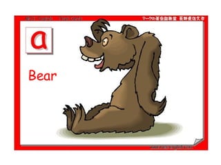 This document contains a list of animals including bear, camel, cow, fish, turtle, elephant, gorilla, hippo, horse, lion, panda, rabbit, penguin, duck and frog.