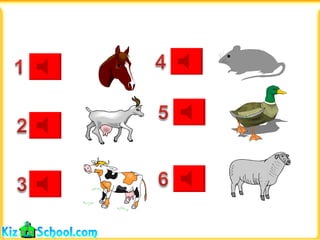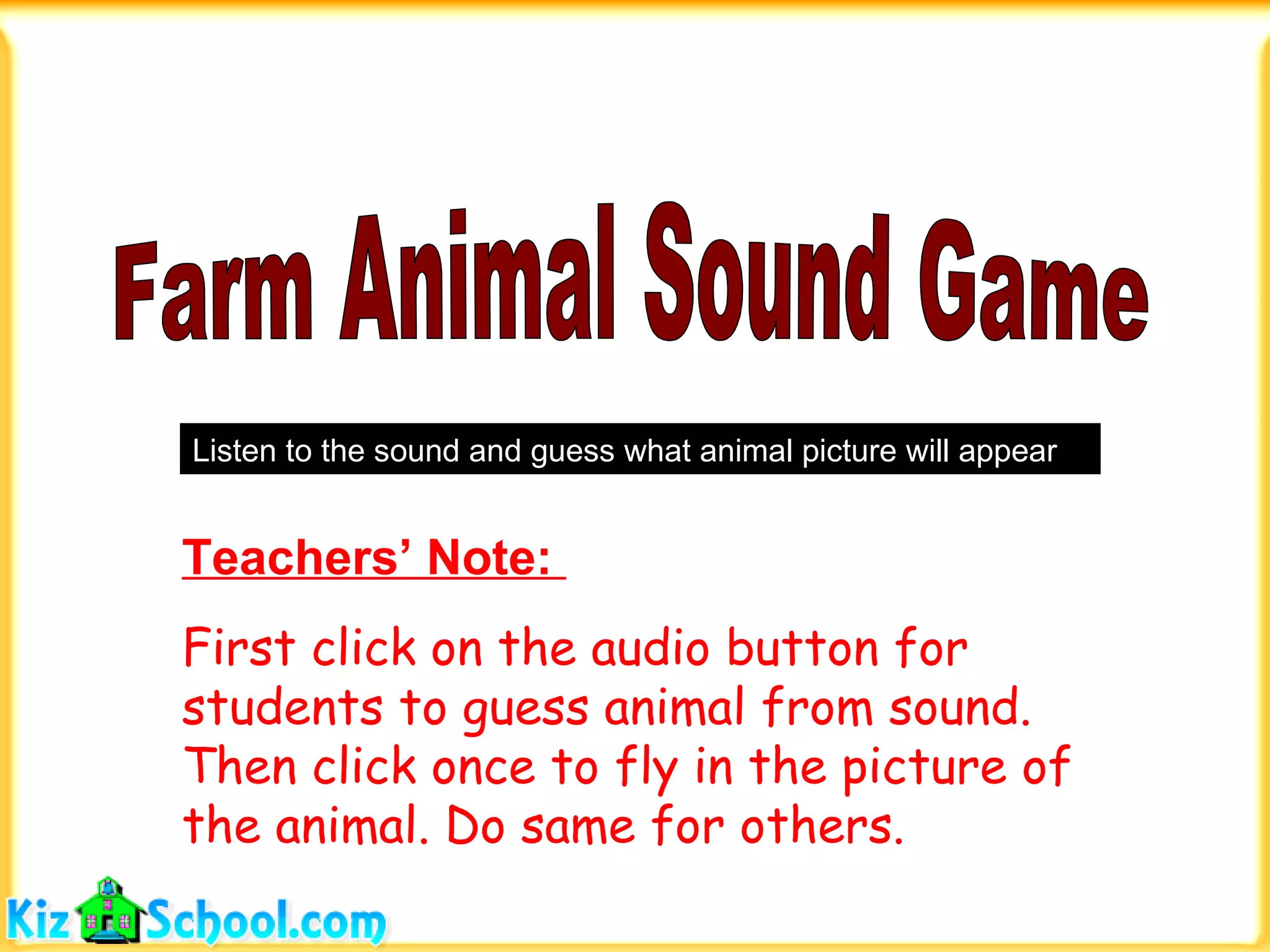 Farm Animal SoundGame Listen to the sound and guess what animal picture will appear Teachers’ Note: First click on the audio button for students to guess animal from sound. Then click once to fly in the picture of the animal. Do same for others.