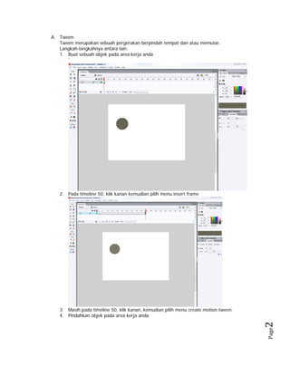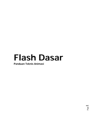 Dokumen ini adalah panduan teknis mengenai animasi menggunakan Flash, mencakup berbagai jenis tween: motion tween, shape tween, guided tween, dan masking. Setiap jenis dianalisis dengan langkah-langkah praktis untuk membuat objek dan menerapkan animasi. Panduan ini memberikan instruksi rinci untuk membantu pengguna memahami dasar-dasar animasi secara efektif.