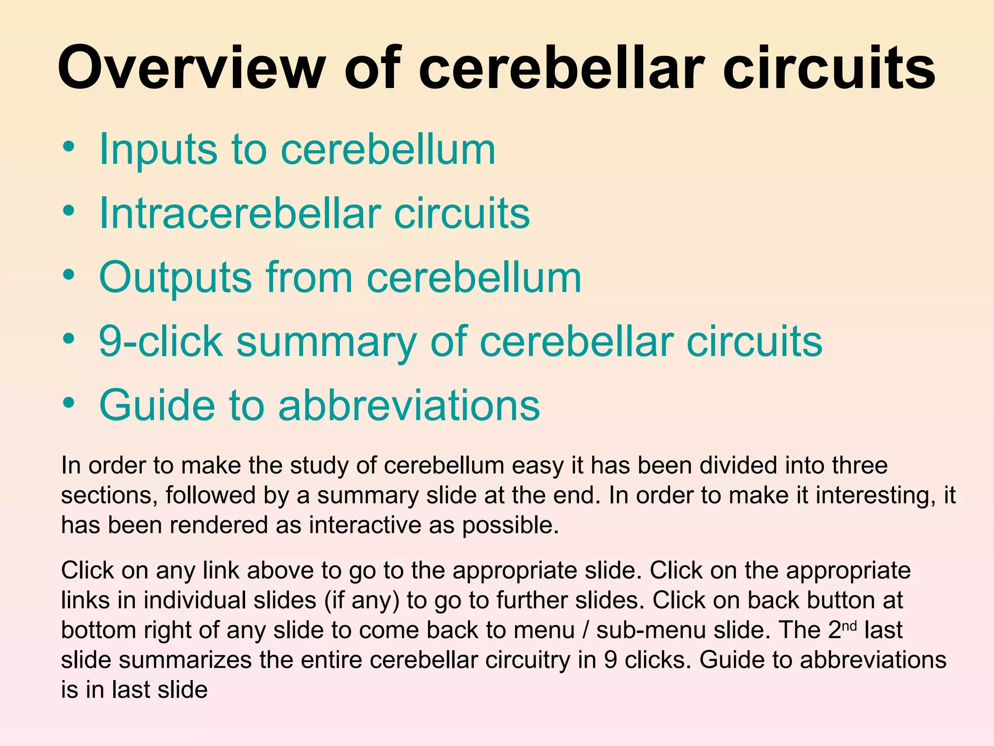 The document summarizes the inputs, circuits, and outputs of the cerebellum in 3 parts: