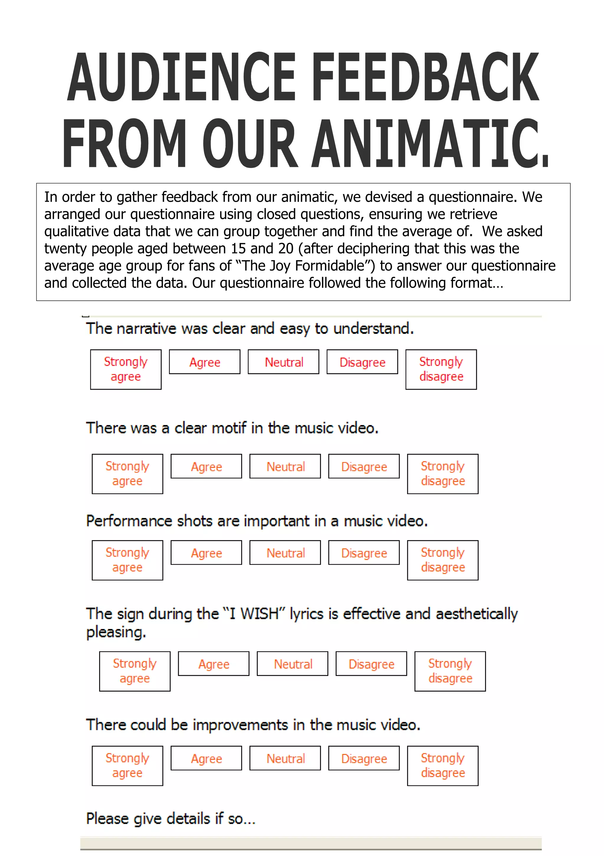 The document summarizes the results of a questionnaire given to 20 people aged 15-20 to gather feedback on an animatic for a music video. The questionnaire used closed questions to collect qualitative data about the narrative clarity, motif, use of performance shots, effectiveness of a sign during lyrics, and potential improvements. The responses were analyzed using tables, graphs, pie charts and bar charts to understand opinions in each area and identify aspects that could be enhanced for the final music video.