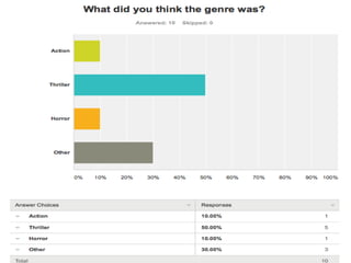 The document summarizes the results of an animatic review for a film project. It found that the majority of reviewers were in the target age group. Half correctly identified the genre as thriller, while others thought action or horror. Over 80% understood the sequence from the animatic despite limitations. Forty percent said they would enjoy watching the full opening scene, while only 20% said no.