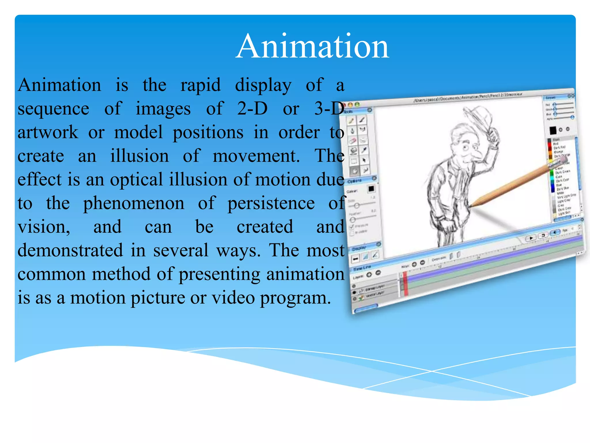 This document provides an overview of animation, including its definition, history, techniques, and status in India. Animation is the illusion of motion created by displaying a sequence of images rapidly. It was discovered in Latin and referred to as the "animating principle." Some key points discussed are: