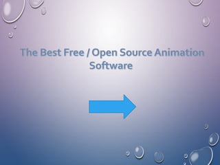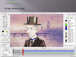 Animation involves using computer software and hardware to turn 2D drawings into moving 3D representations. There are several types of animation including traditional animation done by hand, 2D vector animation, 3D computer animation, motion graphics, and stop motion. Popular 3D animation software includes Maya, 3ds Max, and Cinema 4D, which are used to create visual effects for films, TV, games, and more. Free and open-source options like Pencil and Synfig Studios also provide full-featured 2D animation tools.