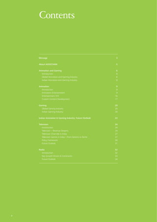 1) The animation and gaming industry in India is growing rapidly at a CAGR of 32% and 13% respectively, but still small at USD 739 million total in 2009. There is potential for much higher growth given India's capabilities in outsourcing and the low share of the global animation and gaming outsourcing markets currently captured by India.