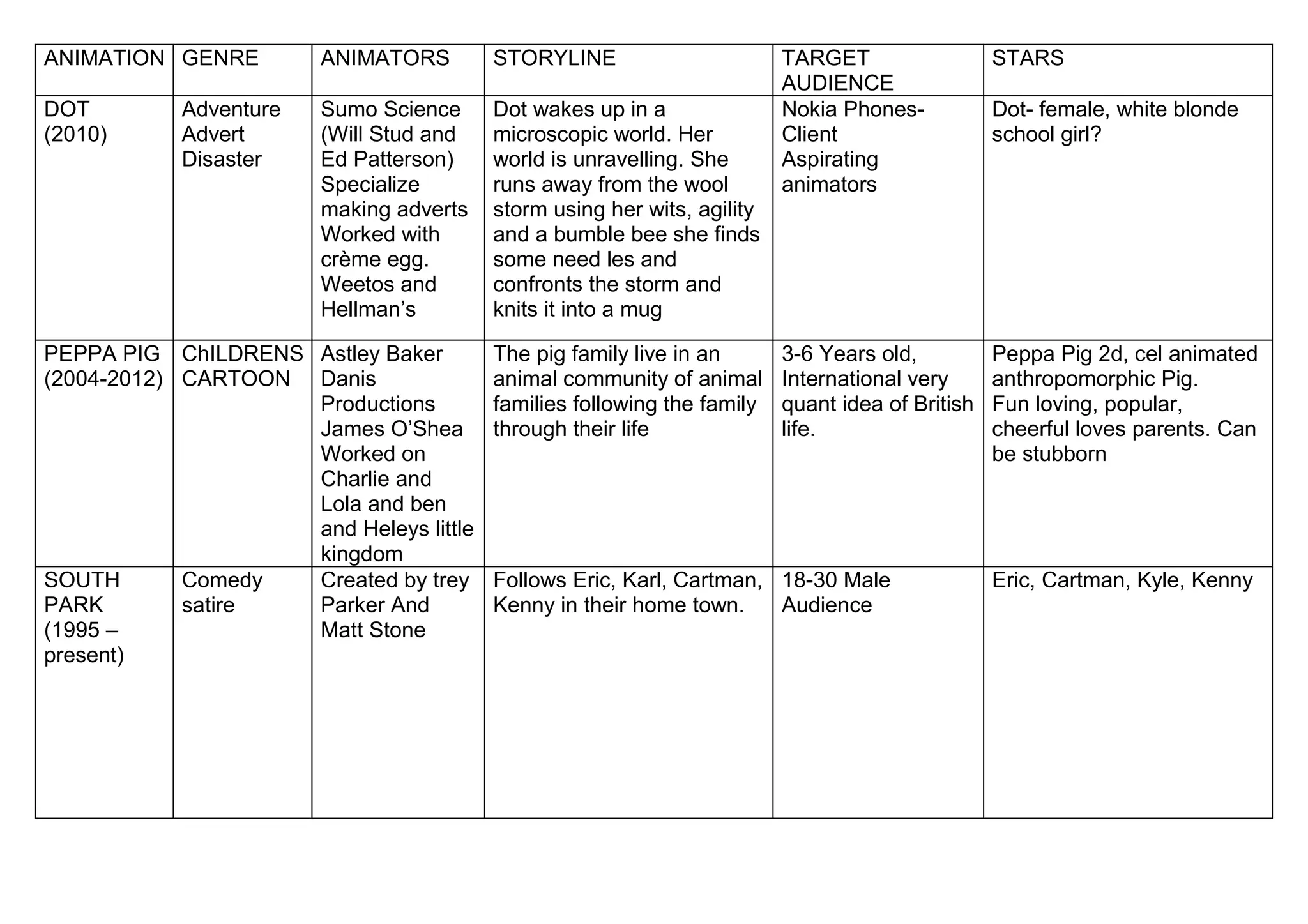 Dot is an animated film about a female schoolgirl named Dot who wakes up in a microscopic world and must use her wits and agility to confront a wool storm threatening her world. The film was created by the animators Will Stud and Ed Patterson at their company Stars Dot to advertise for Nokia phones. Peppa Pig is a British children's cartoon about the everyday life of the anthropomorphic Pig family, including Peppa, a fun-loving and popular pig girl. It was created by Astley Baker Davies Productions and is aimed at 3 to 6 year olds. South Park is an adult animated comedy series that satirizes American culture and follows the adventures of young boys Eric, Cartman,