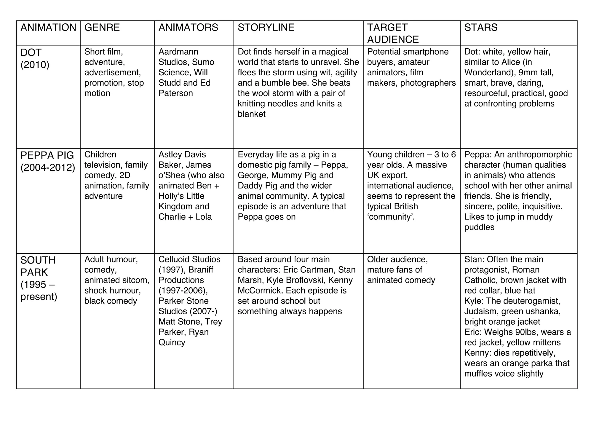 This document summarizes information about three animated works: