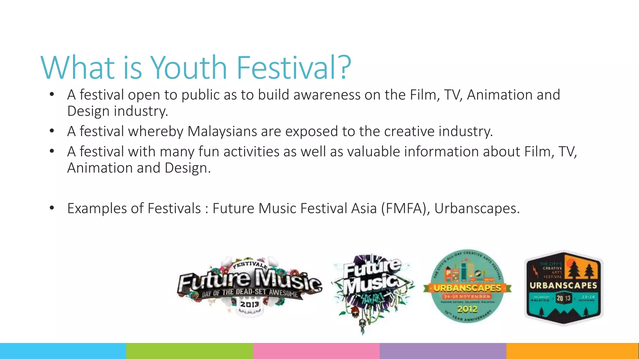 The document describes plans for a Youth Festival focused on film, TV, animation and design to be held by Point College. The two-day festival aims to promote Point College's creative industry programs and careers in the fields. It will include film screenings, workshops, talks and contests. One contest will encourage video submissions promoting tourism in Malaysia to support Visit Malaysia Year 2014. The festival targets youths and the public and hopes to generate interest in Point College's courses and scholarships. It proposes dates in May 2014 at various Kuala Lumpur venues and outlines budgets, potential sponsors and promotional strategies.