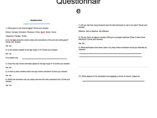 The document summarizes feedback from a focus group on an animation project. All 4 participants identified the genre as animation and said the arts and crafts theme was clear. They also unanimously agreed that the content was suitable and appealing for ages 4-10. However, responses were mixed on whether the narrative was clear throughout, with most saying yes and some no. The strengths identified were that it was easily identified as a kids' animation, while opportunities for improvement included asking more participants of a wider age range for more robust feedback.