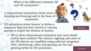 2D animation involves drawing individual frames that are played in sequence to create the illusion of movement, while 3D animation uses 3D modeling software to create depth and realistic textures, lighting, and colors. Popular fields using 3D animation include film, advertising, video, and gaming. Assessing one's skills and characteristics through personal entrepreneurial competencies is important before starting a business to ensure likelihood of success.
