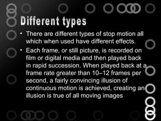 Stop motion animation is achieved by recording individual still frames of motion and playing them back sequentially to create the illusion of continuous movement. Each frame is a slightly altered version of the previous frame with objects moved in small increments. This labor intensive process can involve manipulating physical objects, cutouts, or live actors frame-by-frame to simulate movement. Different stop motion techniques produce varied effects and involve altering material positions gradually over many frames to depict animation.