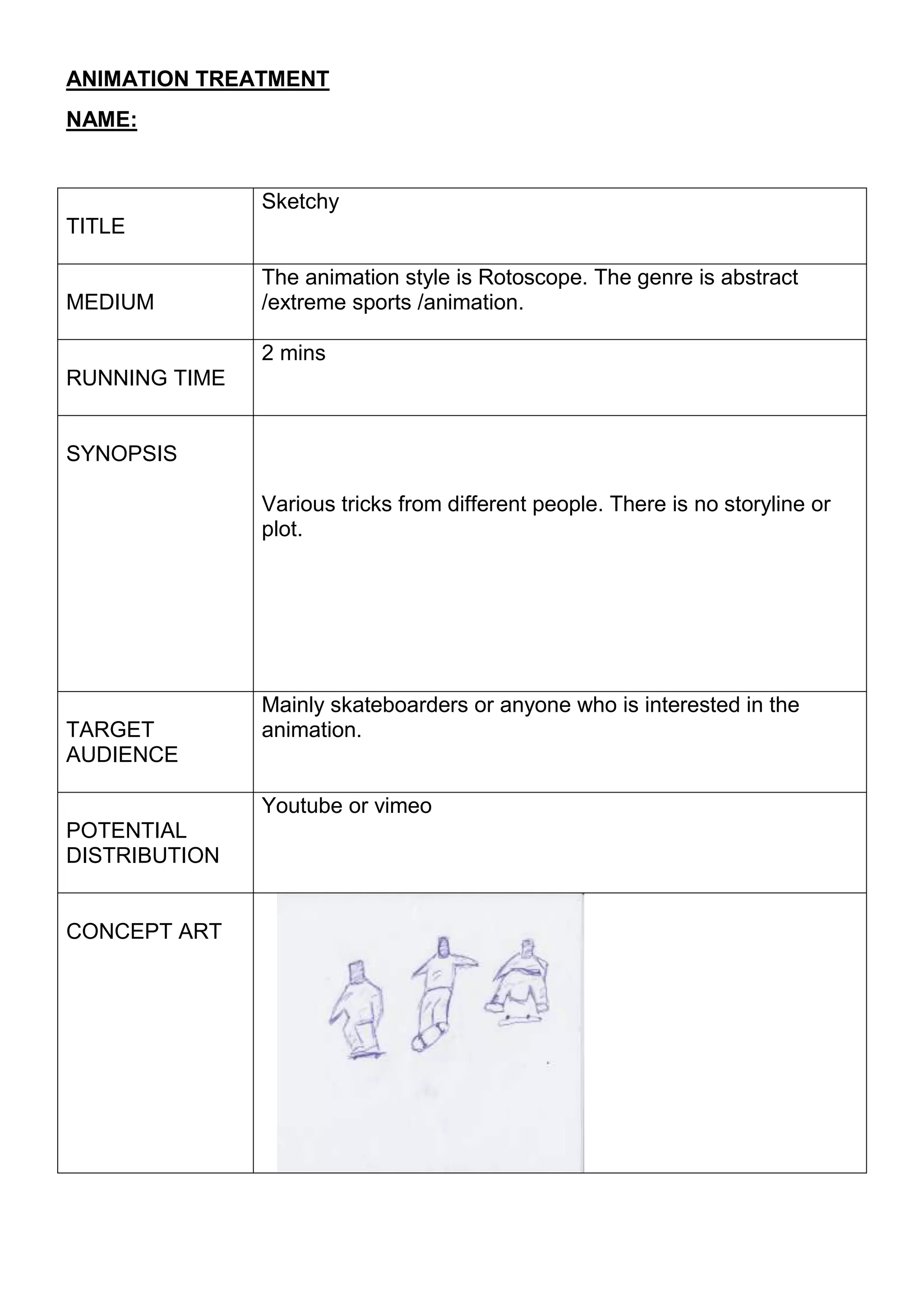 This 2 minute animation titled "Sketchy" uses a Rotoscope animation style to depict various extreme sports tricks without a storyline or plot. The target audience is skateboarders or those interested in the animation style, and it could potentially be distributed on YouTube or Vimeo.