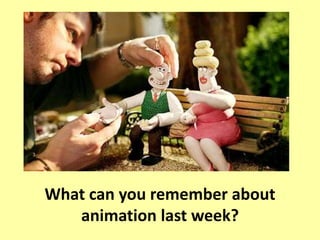 This document discusses various stop motion animation techniques including object animation using found objects, modeling with clay or plasticine, simple clay animation, time lapse photography, pixilation using live subjects, puppetry, and combining different formats. Students are assigned a task to research an animator, explain their animation style, gather pictures and links to their work, compare animations, and discuss the animator's strengths and weaknesses. The aims of the lesson are for students to discuss title sequences, research and explain title sequences, and for some to research animation styles.