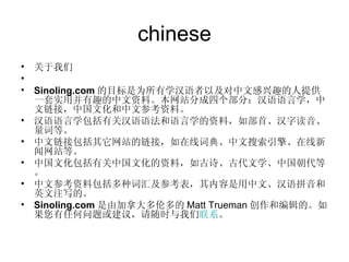chinese 关于我们 Sinoling.com 的目标是为所有学汉语者以及对中文感兴趣的人提供一套实用并有趣的中文资料。本网站分成四个部分:汉语语言学,中文链接,中国文化和中文参考资料。 汉语语言学包括有关汉语语法和语言学的资料,如部首、汉字读音、量词等。 中文链接包括其它网站的链接,如在线词典、中文搜索引擎、在线新闻网站等。 中国文化包括有关中国文化的资料,如古诗、古代文学、中国朝代等。 中文参考资料包括多种词汇及参考表,其内容是用中文、汉语拼音和英文注写的。 Sinoling.com 是由加拿大多伦多的 Matt Trueman 创作和编辑的。如果您有任何问题或建议,请随时与我们 联系 。