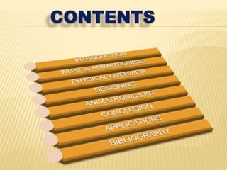 This document discusses animatronics and provides information on its history, technology, and applications. It summarizes that: - Animatronics uses electronics and programming to create the optical illusion of motion in animated creatures through the control of voltages and microcontrollers. Actuators enable facial movements. - Applications include Walt Disney's Enchanted Tiki Room from 1963 as well as theme parks and movies. Skills like electronics, mechanics, sculpting, and control technology are important for animatronics careers. - Diagrams show examples of animatronic robot kits, components like servos and software, and how a full animatronic system works using elements like a motor system, face and