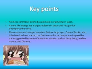 Anime is commonly defined as animation originating from Japan. It typically features large eyes and exaggerated features inspired by early American cartoons. Anime characters are usually 7-8 heads tall and employ predetermined facial expressions to denote mood. Anime began in the early 1900s as Japanese animators experimented with techniques from other countries. By the 1930s, animation became an alternative to live-action films in Japan. Following some success abroad in the 1980s, anime gained wider acceptance in international markets in the 1990s with popular titles like Dragon Ball Z and Pokémon.