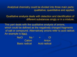 2) Common tests involve adding reagents like barium chloride, silver nitrate, and iron (III) chloride to detect anions via formation of insoluble precipitates.