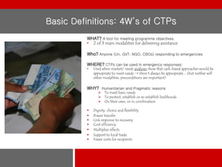 The document discusses cash transfer programming (CTPs) in Asia. It provides definitions of CTPs, noting they can be used by any organization responding to emergencies. CTPs are used to meet basic needs, protect or reestablish livelihoods. Spending on CTPs has increased from $46 million in 2008 to $117 million in 2012. The Cash Learning Partnership (CaLP) works to build capacity and share information on CTPs. CaLP aims to have CTP routinely considered as an emergency response option. The document outlines some CTP activities in different Asian countries and discusses the relevance of CTPs and new technologies for social innovation in Asia.